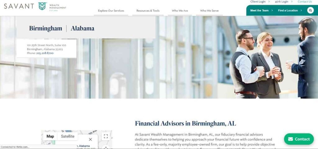 At Savant Wealth Management in Birmingham, AL, our fiduciary financial advisors dedicate themselves to helping you approach your financial future with confidence and clarity. As a fee-only, majority employee-owned firm, our goal is to help provide objective advice that aligns with your best interest. From our office at 101 25th Street North, we work with individuals, families, and business owners to create customized strategies for managing, growing, and protecting wealth.